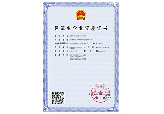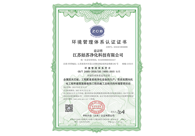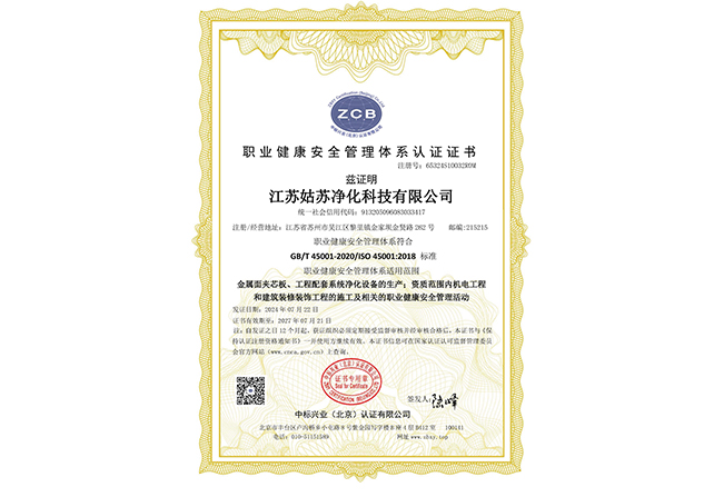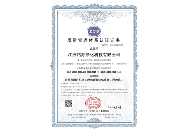 江苏姑苏净化科技有限公司,具有国家电子与智能化工程壹级资质,国家机电安装工程壹级资质,国家建筑装修装饰工程壹级资质 姑苏净化科技有限公司,具有国家机电工程施工总承包贰级、国家空气净化工程二级资质,国家电子与智能化工程二级资质,国家机电安装工程二级资质,国家建筑装修装饰工程二级资质,消防设施工程专业二级资质企业。